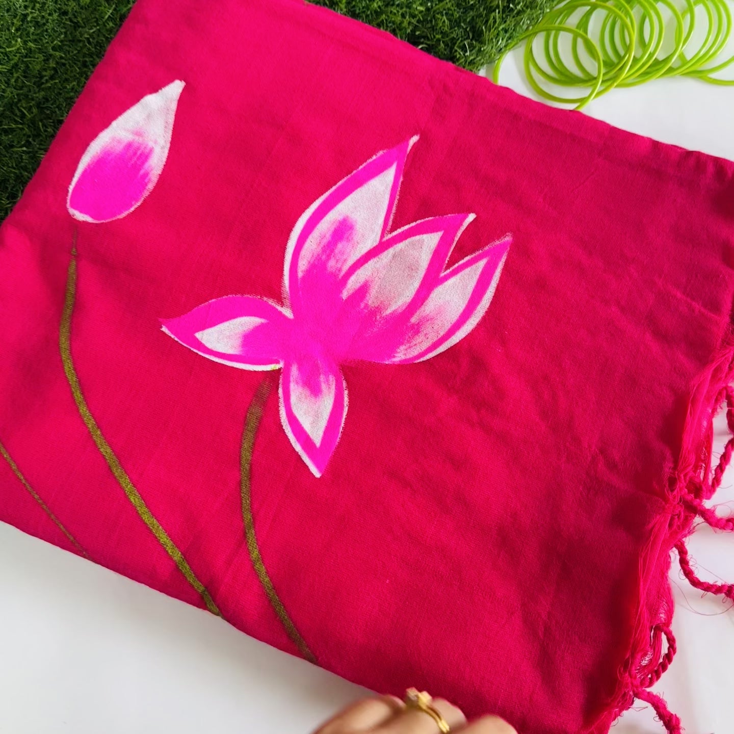 Let your wardrobe bloom with Gulabi Kamal, a radiant handpainted saree inspired by the grace of lotus blossoms. Painted in bold strokes of pink and white on a vibrant magenta canvas, this saree is an ode to feminine strength and serenity.