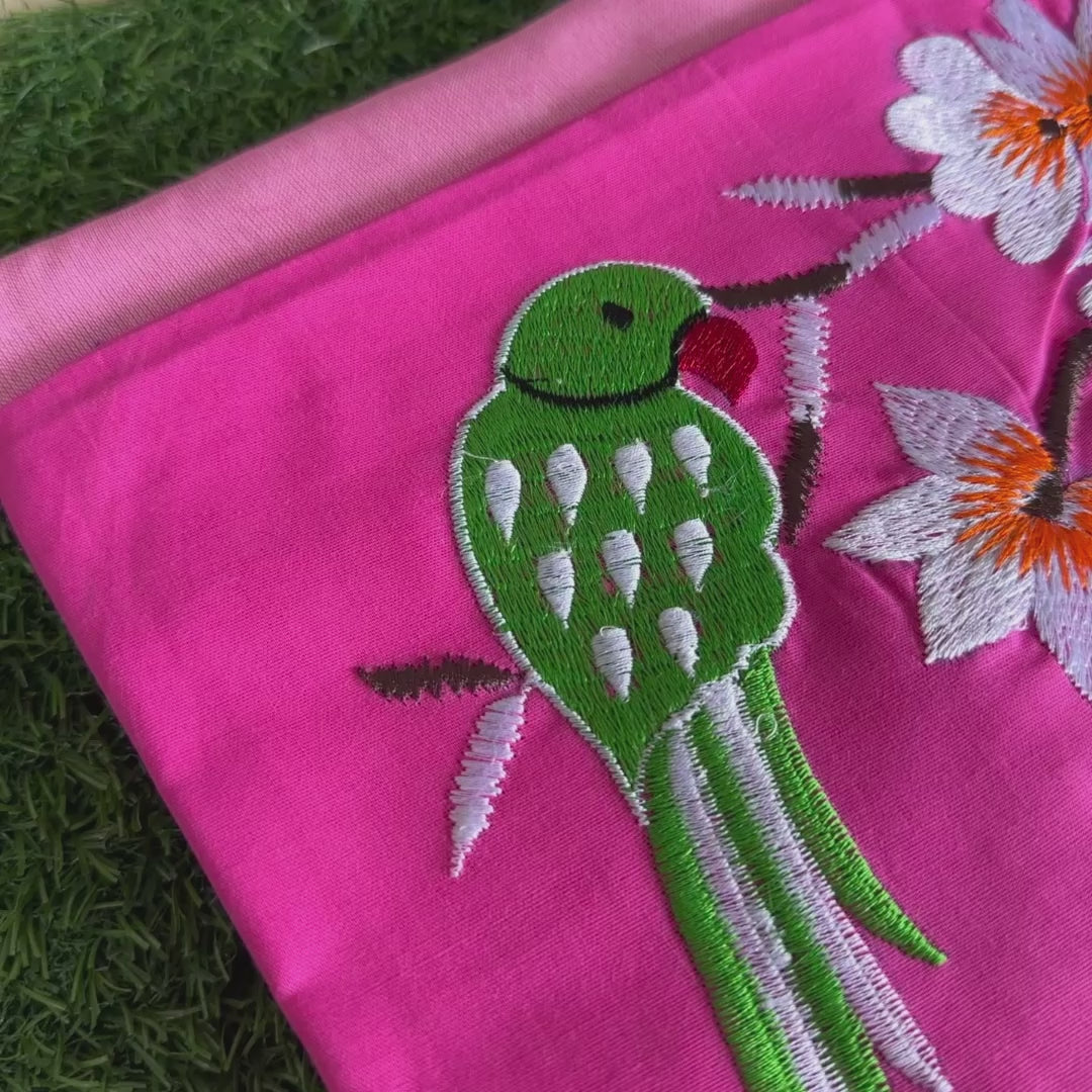 Blouse Piece: Darl Pink with intricate parrot & floral embroidery (Unstitched)
