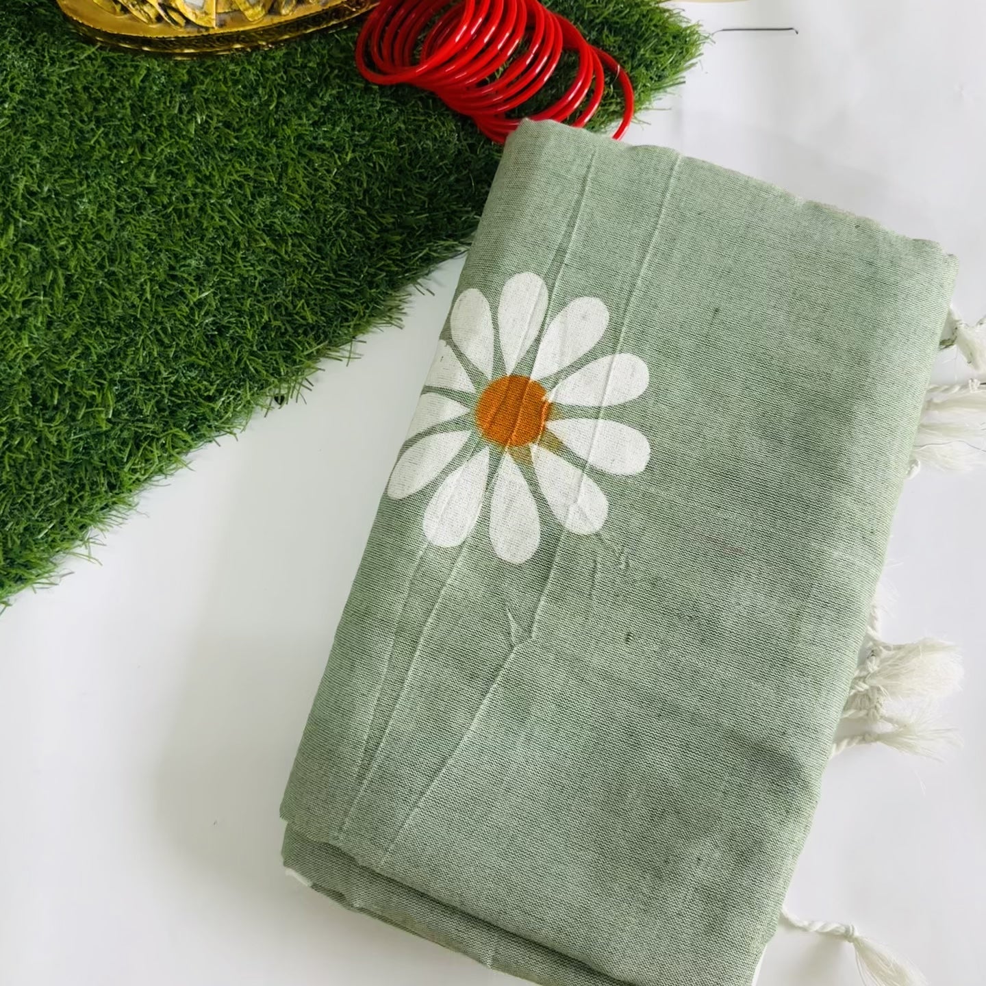 Soft, earthy, and full of soul — Sage Bloom is a serene blend of nature and artistry. This handpainted khadi cotton saree features delicate white sunflower motifs with warm orange centers dancing across a tranquil sage green backdrop. Its minimalist design and breathable fabric make it a perfect pick for effortless daytime elegance. Ideal for brunches, art fairs, or slow mornings, this saree brings calm sophistication and handmade warmth to every drape.