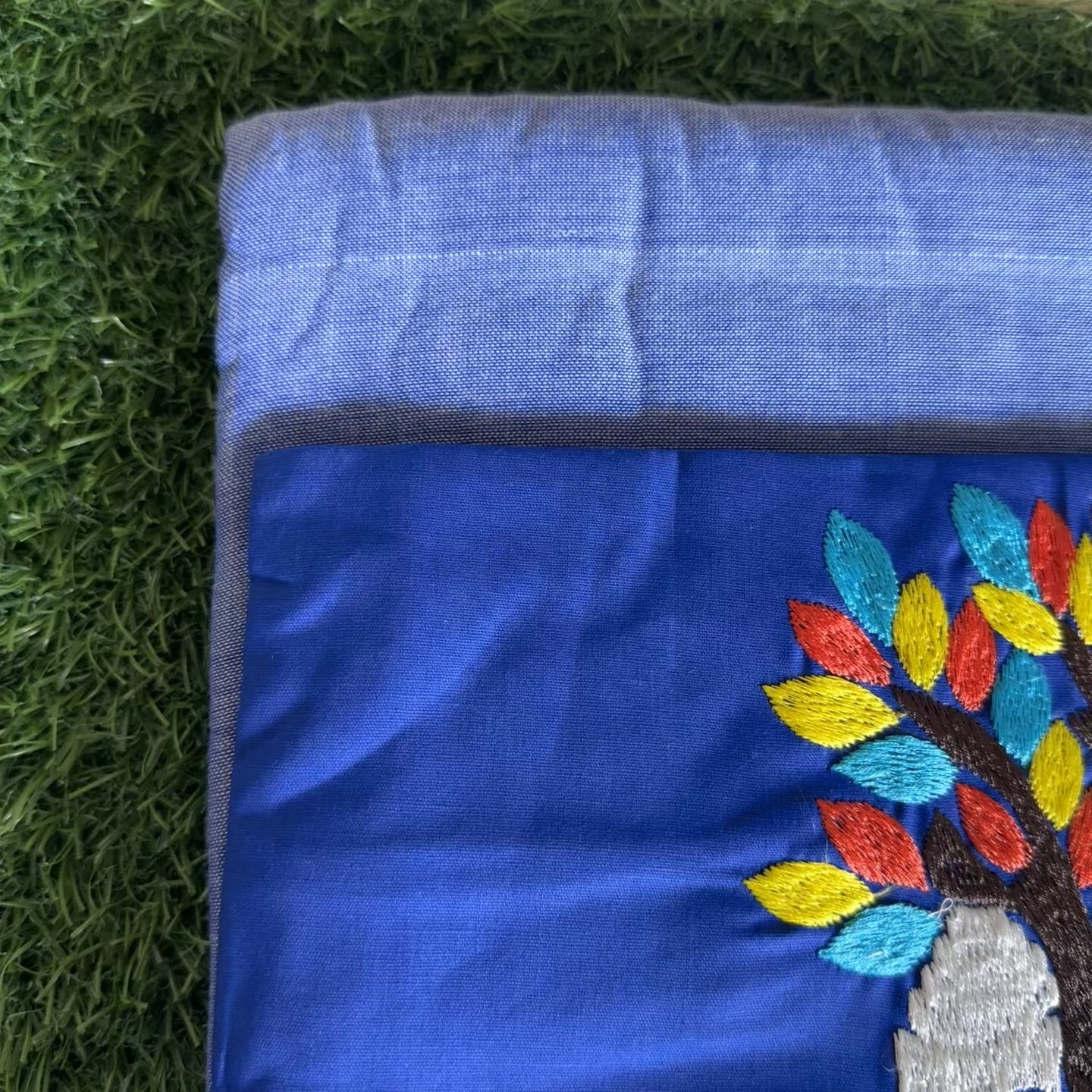 The highlight is its exquisitely embroidered blouse piece featuring a meditative Buddha under a vibrant tree of life — a symbol of peace, mindfulness, and rooted strength. Each detail is carefully stitched to reflect traditional craftsmanship with a modern spiritual aesthetic.