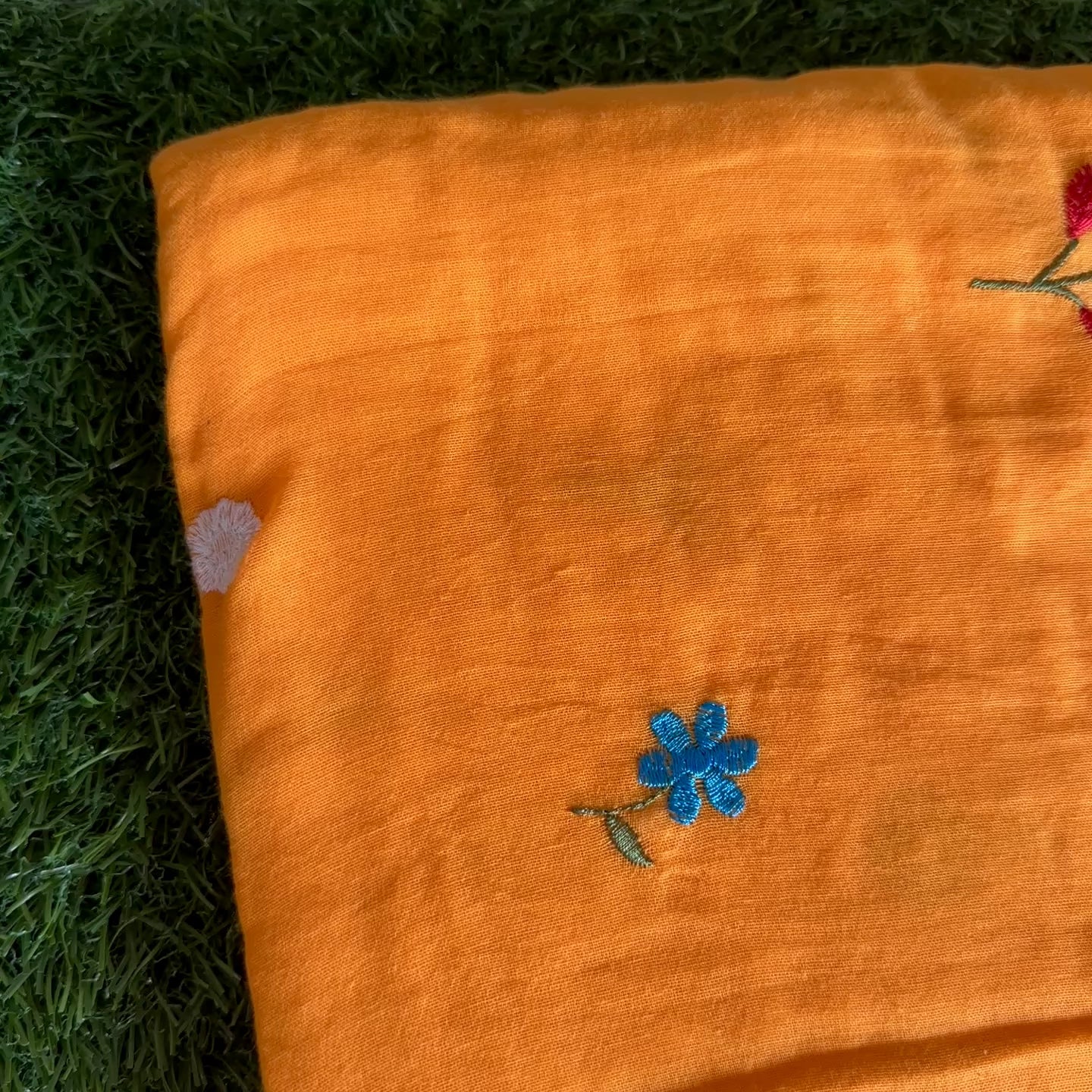 Radiate elegance with our Sunshine Bloom saree, crafted in soft, breathable mul cotton. The bright marigold hue is adorned with delicate hand embroidery of colorful floral motifs, making it perfect for festive days or casual elegance. Accented with playful red, white, and blue tassels on the pallu, this saree is a celebration of comfort, craft, and color.