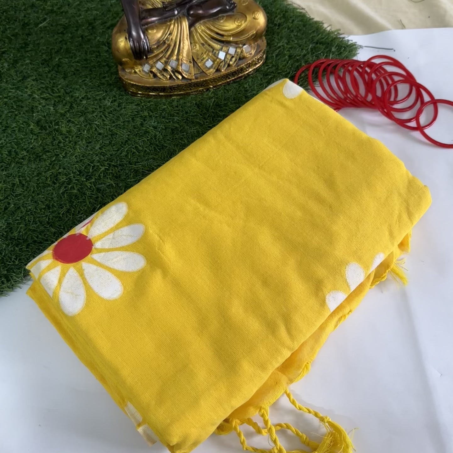 Bring home the warmth of sunshine and the charm of hand-painted art with Surya-Daisy. This radiant khadi cotton saree in a bold sunshine yellow is adorned with handpainted white sunflower motifs featuring striking red centers, offering a vibrant contrast that’s playful yet elegant.