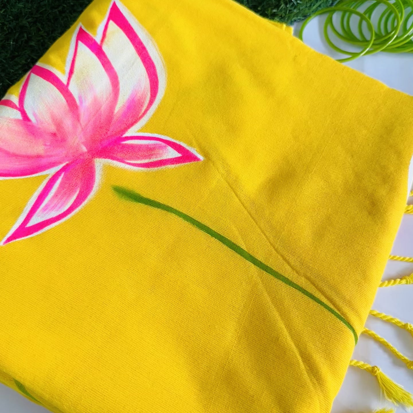 Radiant as the morning sun and soft as a summer breeze — Surya Padma is a celebration of light, warmth, and grace. Drenched in a sunshine yellow hue and adorned with a handpainted pink lotus, this saree brings nature’s poetry alive with every pleat.